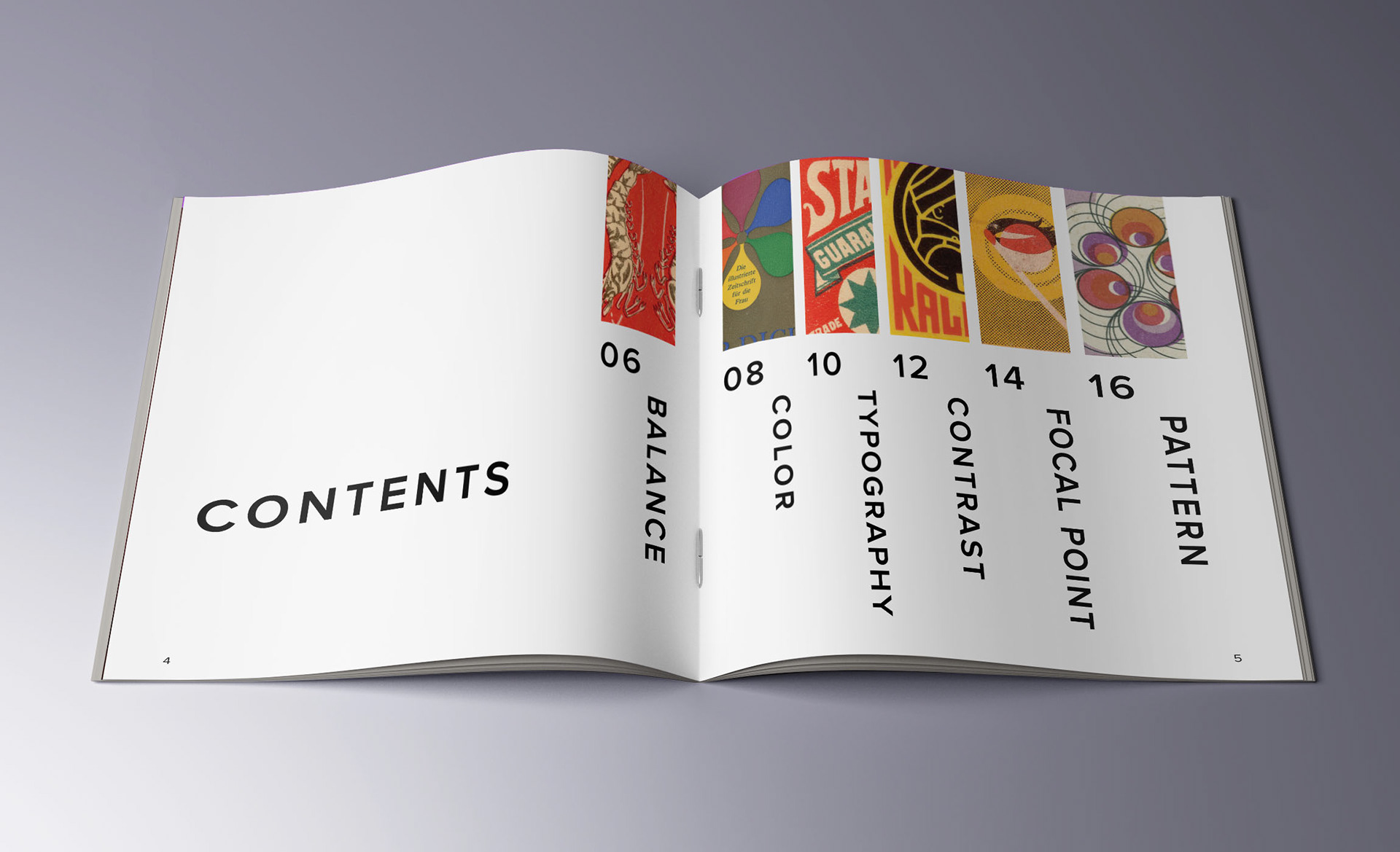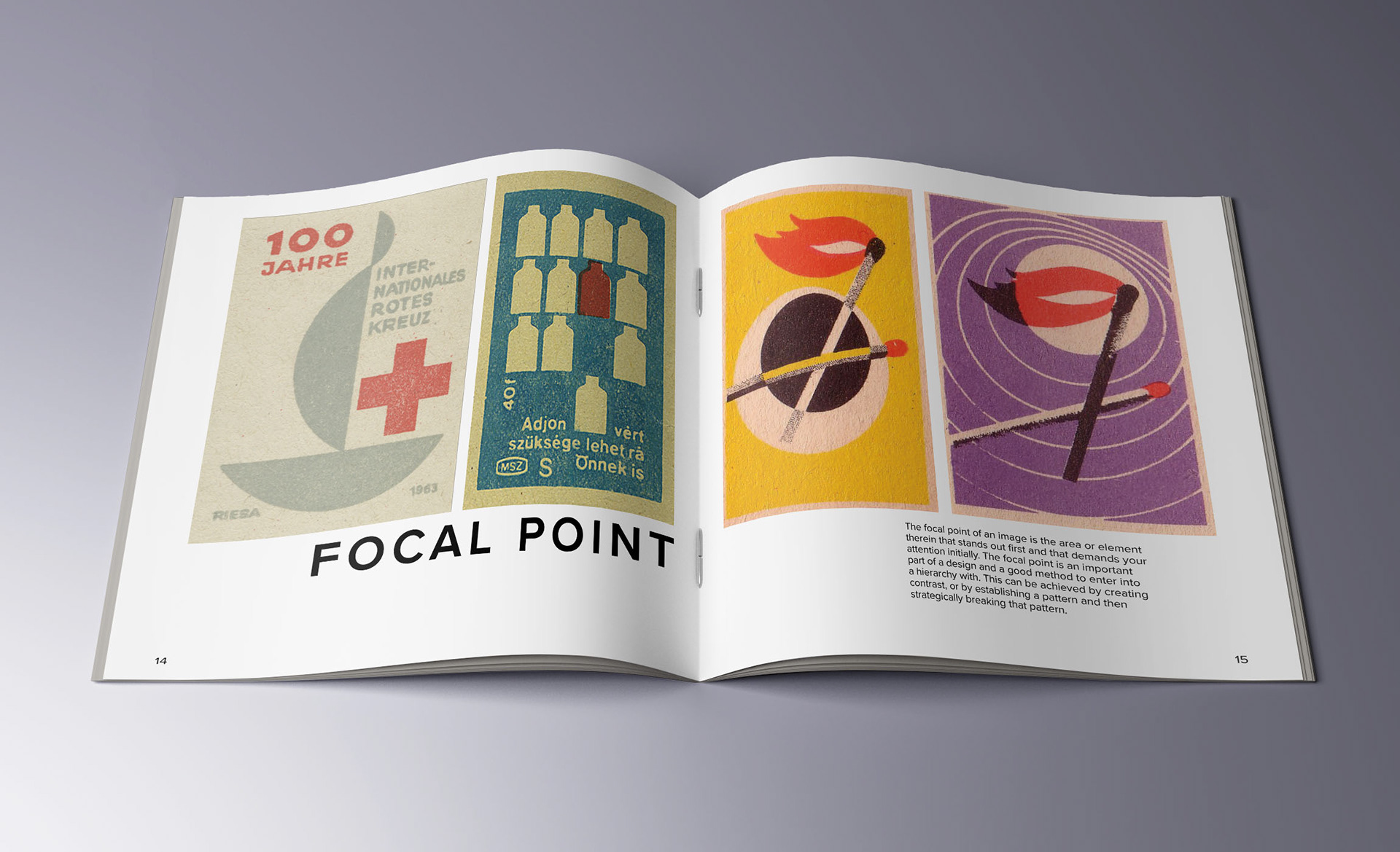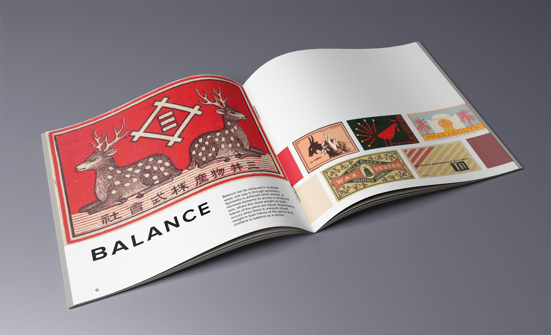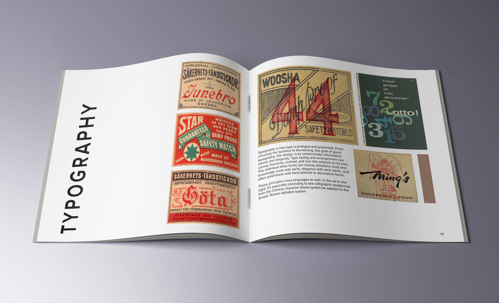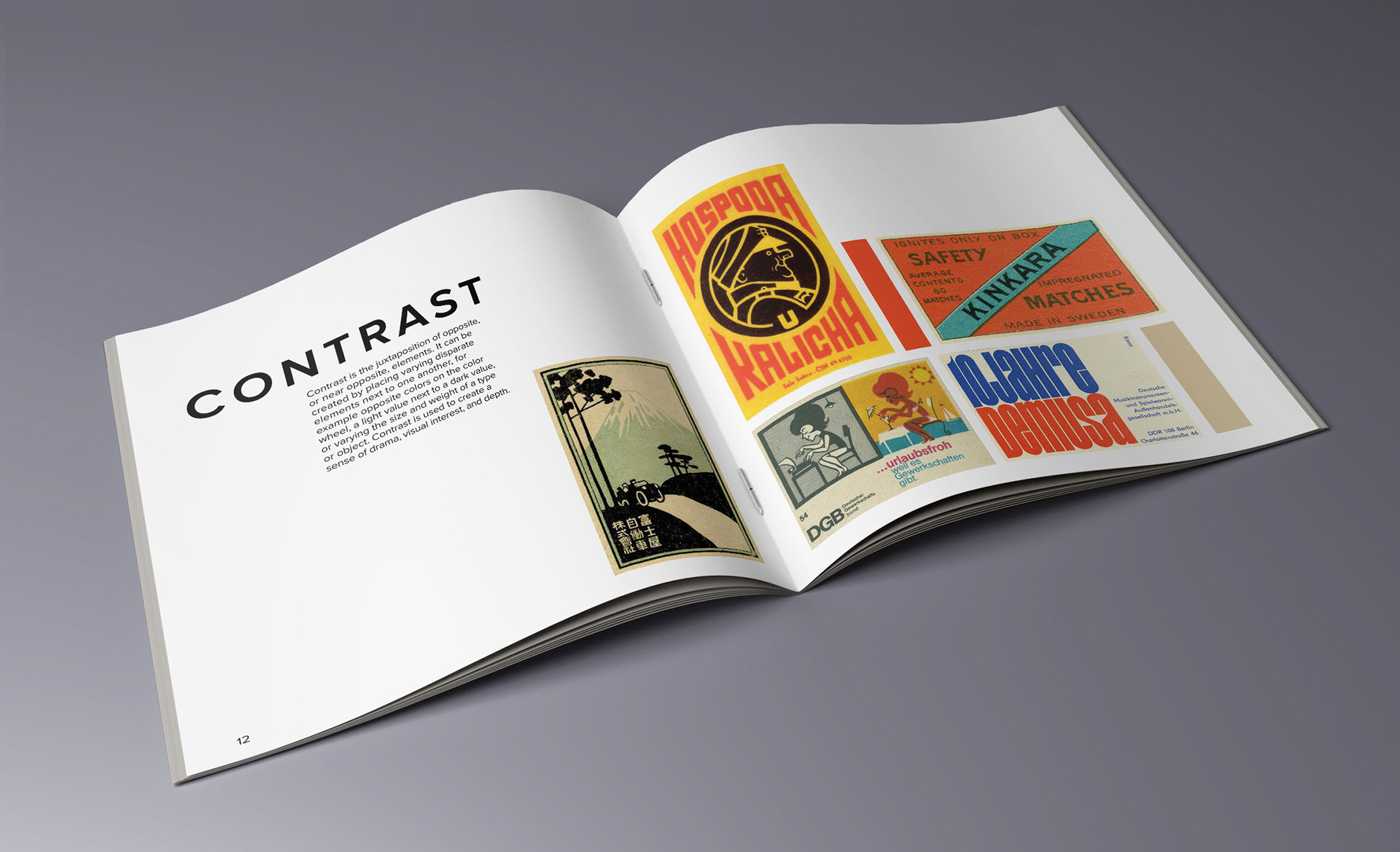 For this project I was inspired by and used scans of old matchbooks to illustrate design principles. The cover was made in Adobe Illustrator and the book was put together in Adobe InDesign.