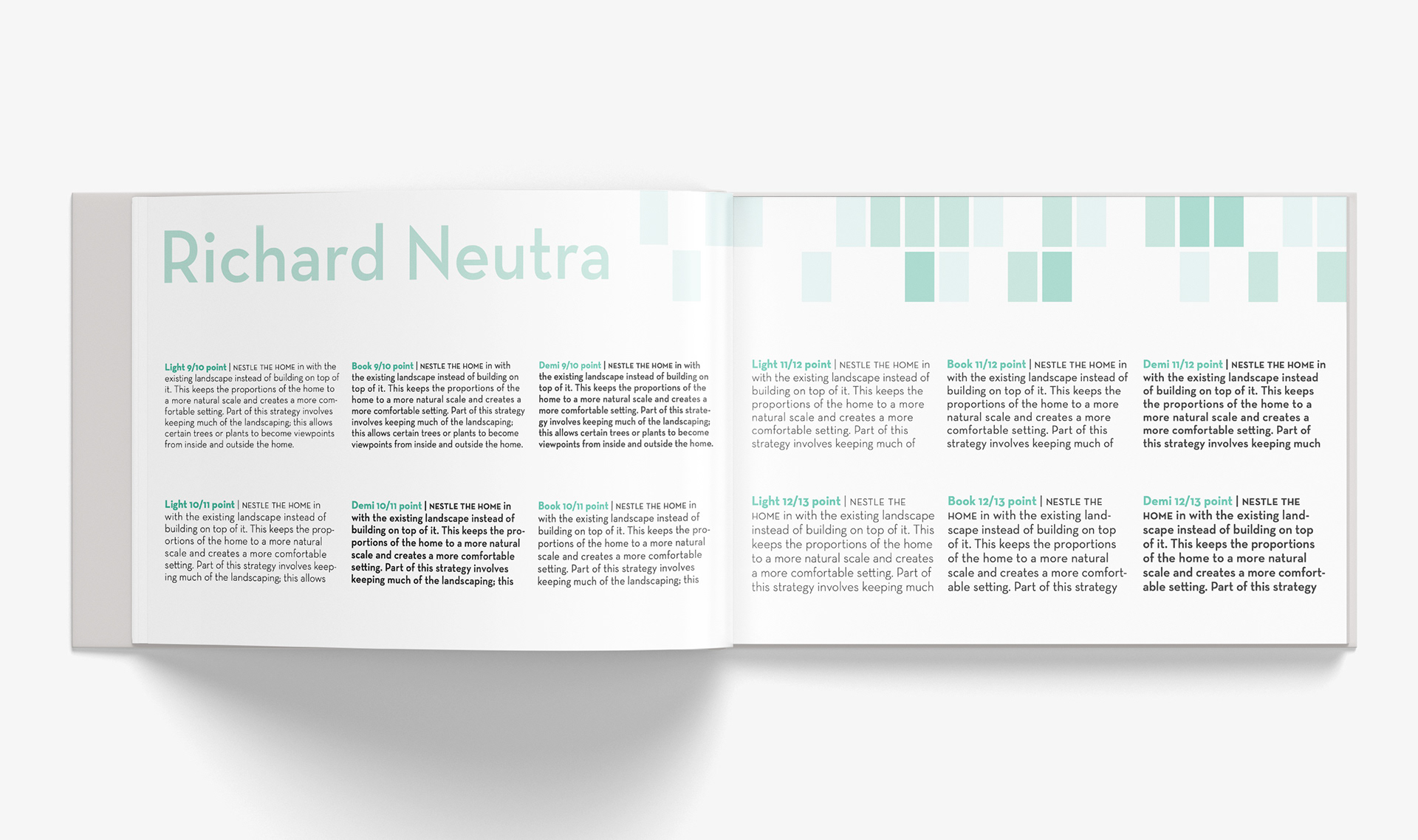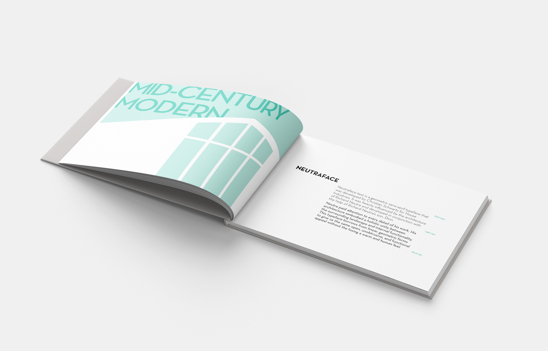 For this project I designed a type specimen book that highlights the Neutraface type family. It, like the typeface, was inspired by by mid-century modern design. The internal illustrations were done in Adobe Illustrator and the book was put together in Adobe InDesign.