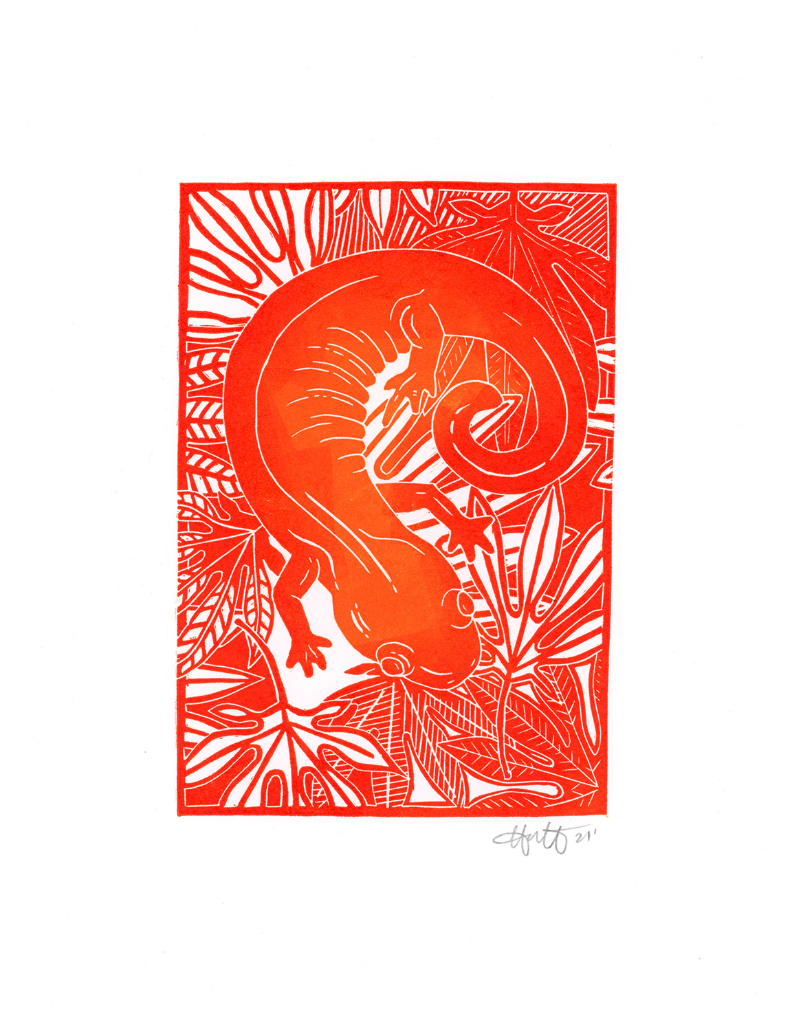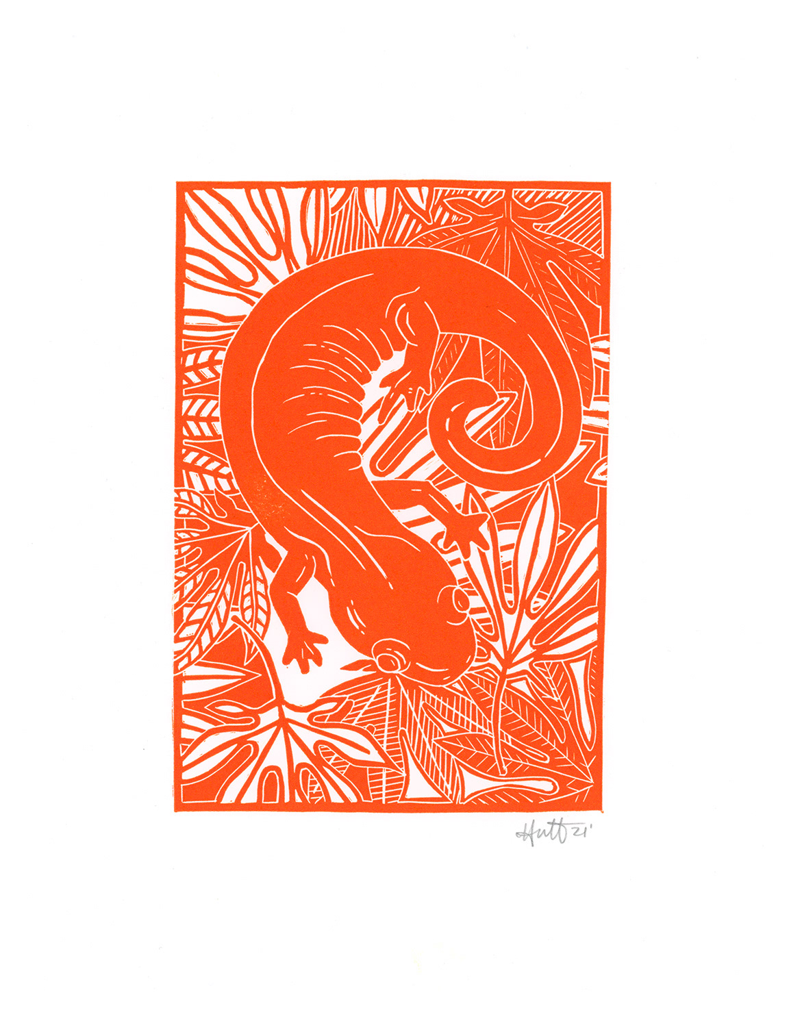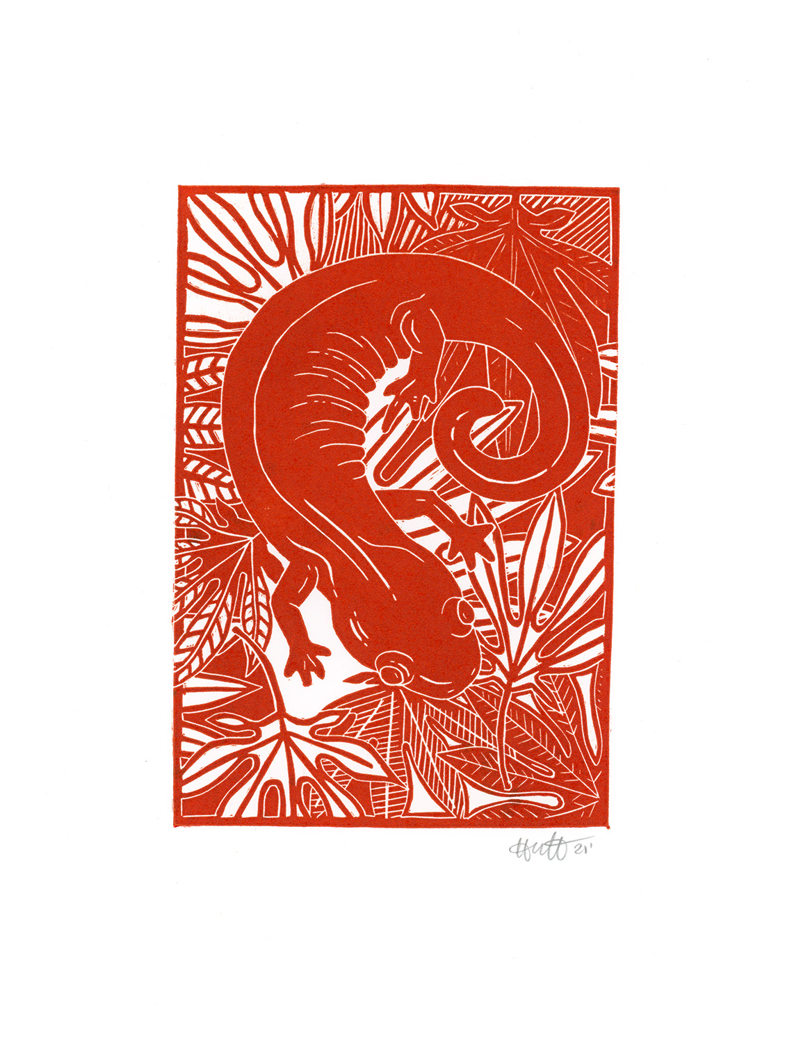 Salamander Block Print (1 of 1), 2021, oil based ink, 5x7" hand printed with a printing press on 8.5 x 11" acid free card stock